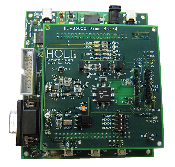 The Holt ADK-35850 Evaluation board demonstrates the features of Holt’s HI-35850 ARINC 429 protocol IC. The HI-35850 includes a single ARINC 429 line receiver and a single ARINC 429 line driver, along with ARINC 429 specification digital protocol. The HI-35850 is a new version of Holt's well known HI-3585, with a much improved 12MHz SPI host interface. The evaluation kit includes an ARM Cortex M3 base board and a HI-35850 plug-in daughter card.