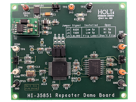 The Holt ADK-35851 Evaluation board has jumpers to configure the RX and TX speeds, label flip, and also headers for input power, input ARINC 429 and output ARINC 429. There are also wire holes to aide in building the repeater board into an assembly.