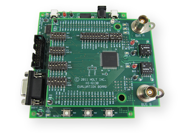 The lower ARM Cortex M3 board is based on the flash-programmable Atmel AT91SAM3U-EK microprocessor. A 16-bit parallel bus interface connects to the HI-6130. A UART-based serial port provides RS-232 console I/O (optional). An uncommitted USB 2.0 port is available for future expansion. Two pushbuttons are available for software interaction. A RESET pushbutton resets the ARM microprocessor, which in turn controls the HI-6130 Master Reset signal.