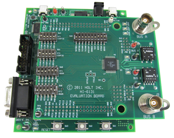 The lower ARM Cortex M3 board is based on the flash-programmable Atmel AT91SAM3U-EK microprocessor. A 4-signal Serial Peripheral Interface (SPI) clocked at 16MHz (20MHz is possible) connects to the HI-6131. A UART-based serial port provides RS-232 console I/O (optional). An uncommitted USB 2.0 port is available for future expansion. Two pushbuttons are available for software interaction. A RESET pushbutton resets the ARM microprocessor, which in turn controls the HI-6131 Master Reset signal.