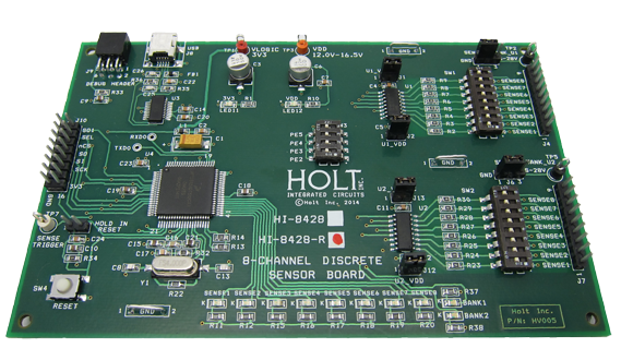 The Holt CD, included with the evaluation kit, contains example source code, providing an easy path for the customer to develop their own control software. A Serial UART output from the MCU provides debug and data messages to be sent to a PC using any terminal emulation program such as Tera Term. The HI-8428-R Evaluation Board has two HI-8428-R devices mounted on the board so the customer can evaluate SPI daisy chain operation. A bank of LEDs monitors the outputs on either bank of eight sensors.