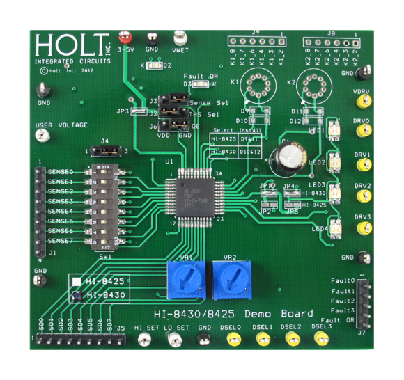 The HI-8430 Evaluation Board allows the user to evaluate the HI-8430 avionics discrete-to-digital sensing IC. The HI-8430 includes eight sensor input channels and four high-side output drivers. The eight input channels are configurable for either Ground/Open or Supply/Open sensing depending on the state of the SNSE_SEL pin. The board features jumpers, DIP switches, test points, LED’s and two potentiometers to facilitate IC testing and evaluation.