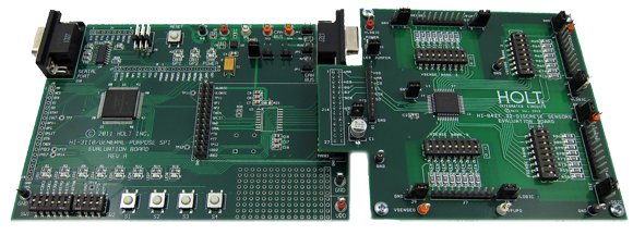 The Holt HI-8437 Evaluation Board demonstrates the features of the HI-8437, a 32 channel discrete-to-digital sensor IC with SPI interface and high impedance inputs. The HI-8437 has a low threshold sensing capability, programmable in 100mV increments from 0.4V to 5.2V. The EVM (Evaluation Module) plugs into a Holt ‘General Purpose SPI Evaluation Board, based on a Freescale MC9S12XDT512 microcontroller motherboard. The motherboard MCU communicates with the HI-8437 via the SPI interface. Switches and LEDs help navigate the operating modes and confirm data and status information. A Serial UART output from the MCU provides debug and data messages to be sent to a PC using any terminal emulation program such as HyperTerminal. Example source code is provided with the kit, enabling the customer to develop their own control software.