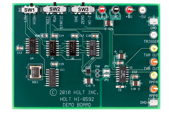 This kit demonstrates the features of Holt's HI-8592 CMOS ARINC 429 Line Driver.