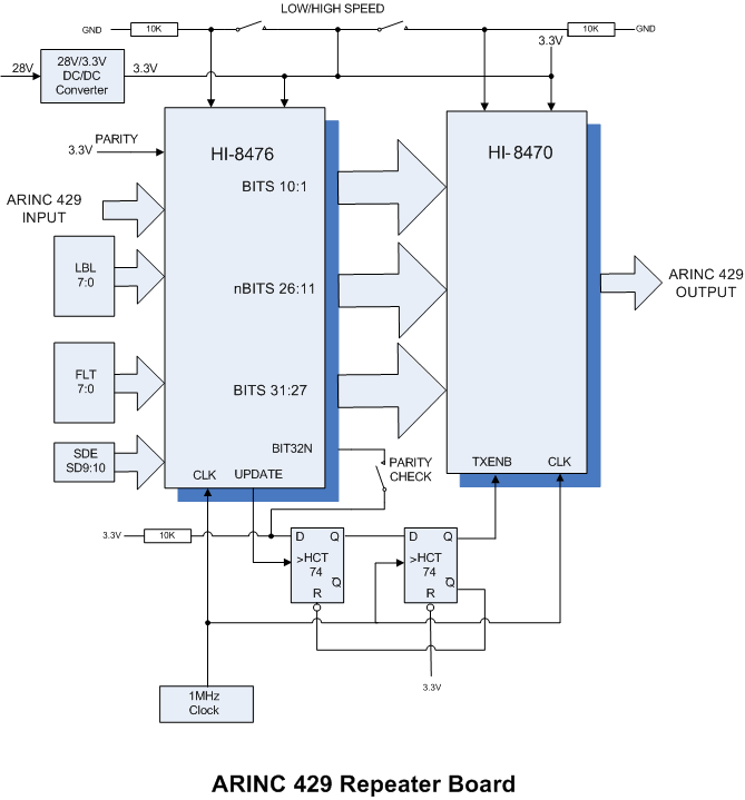 Two additional reference designs demonstrate the use of these devices in common aerospace applications. The ADK-8476 RPT board demonstrates a simple ARINC 429 repeater made from just a HI-8476 device and a HI-8470 device. This two component solution eliminates the microcontroller, software and associated certification costs, and additional ARINC 429 protocol devices needed in traditional repeater designs. The ADK-8470 ADC board demonstrates how analog sensor data generated by a simple A-to-D converter can be periodically transmitted on an ARINC 429 bus, without using an MCU.